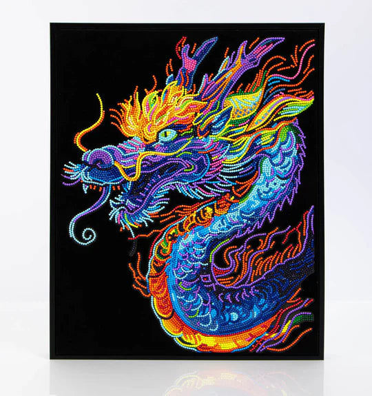 Ignite your imagination with the fierce and fiery Diamond Dotz Neon Dragon Diamond Painting Kit. This kit features a unique diamond painting innovation: bright neon Dotz placed on a soft velvet-like flocked black background. Bursting with vibrant rainbow colors on a bold black background this mythical masterpiece is a must-have for fans of Diamond Painting Kits for Adults and neon diamond art.